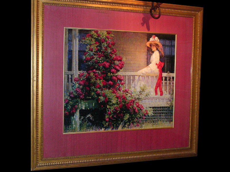 日差しを浴びたバルコニーに腰掛ける帽子の婦人。眩しいほどの美しい出来栄えである。