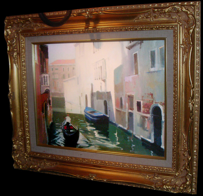 美しい朝のベニス。これから一日が始まろうという静かな澄んだ空気感さえ漂う作品である。まだ客も乗せていないゴンドラが静かに仕事場へと向かう。