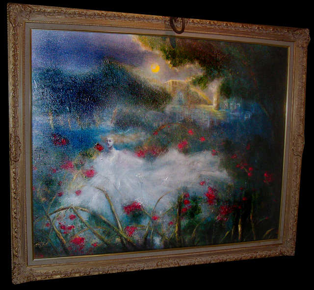サインがあるが、読めず作者不詳。30号。物語の一場面を切り取ったような象徴派の絵画を思わせる。月明かりの館を背景に、一人の魅惑的な白いドレスの婦人。パーティーを抜け出し、目に見えない何かに惹かれ湖畔に佇んでいる。あるいは、意にそぐわない結婚の為、逃げ出した花嫁……と見る者の想像をかきたてる作品である。