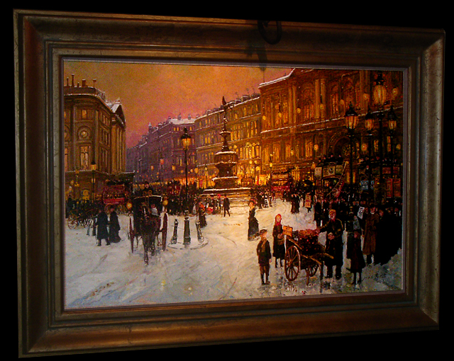 夕暮れ時の雪景色のピカデリーサーカス広場。世紀末の優雅なひと時。焼き栗屋の屋台に並ぶ紳士達が何とも微笑ましい。