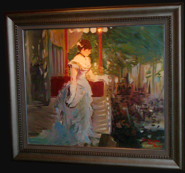 在銘作家と思われますが、詳細は判明しません。 優雅なドレスで着飾った貴婦人が、夜会の後で夕涼みをしている様を場面に描いた作品です。淡い色彩で印象的な仕上がりとなった力のある作家の作品です。