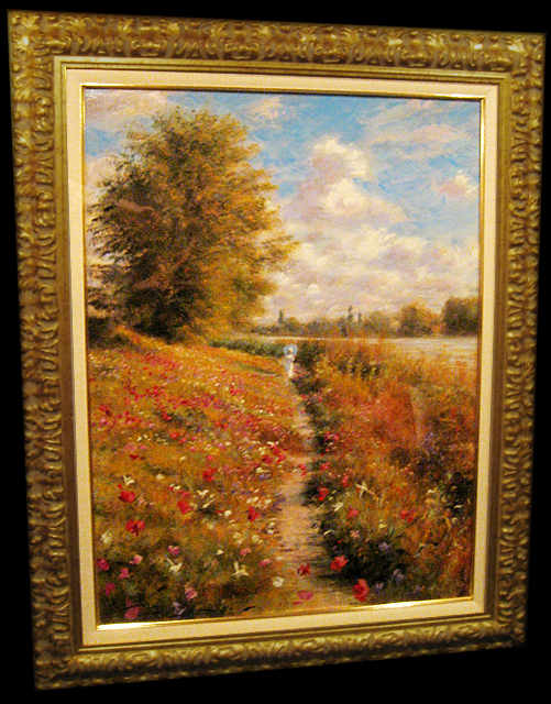 モネを想わせる印象派のイタリア人画家。 初秋の日差しに咲き誇るコクリコ。そして日傘の婦人。澄んだ空気と風が感じられる作品。